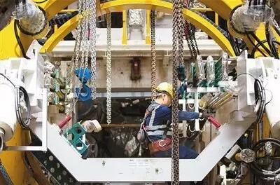 在“一带一路”工程项目以色列特拉维夫轻轨红线施工现场,一名中国工人在组装盾构机。 新华社记者郭昱 摄