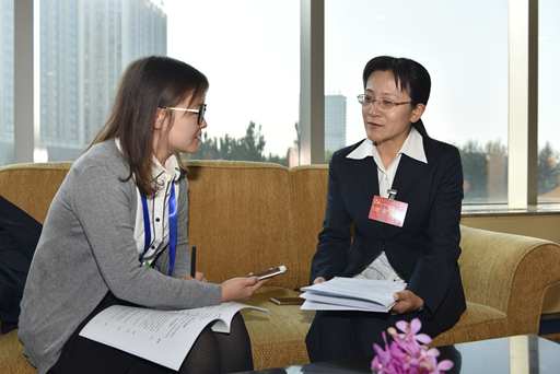 中共包头市第十二次代表大会会议期间,白凌云党代表接受记者采访。