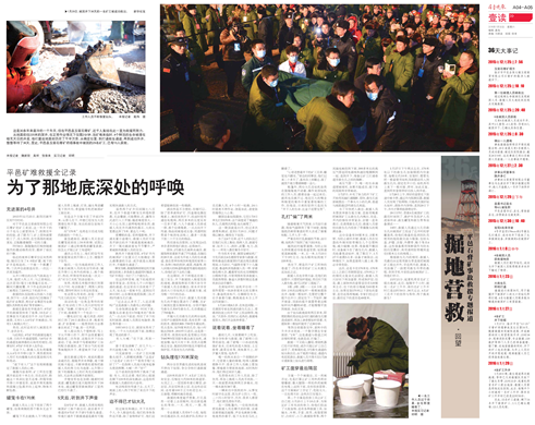 2015年末,山东平邑发生一起废弃石膏矿坍塌事故,多名矿工被困井下。为充分还原整个救援过程,齐鲁晚报记者不畏寒夜,坚持蹲守多日。2016年1月29日深夜矿工被救出,30日一早齐鲁晚报便呈现10个版的全方位、多角度报道,对被困人员的求生渴望与救援人员执着信念作出致敬。