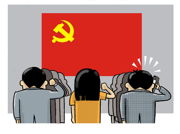 习近平总书记在全国党校工作会议上的讲话中指出,在新形势下,党校工作必须向党中央看齐,向党的理论和路线方针政策看齐。没有规矩、纪律意识高于天,看齐意识无法内化于心,外化于行。该作品形象、有趣、巧妙地把某些党员的规矩、纪律意识淡薄形象化地揭露出来。没有规矩、纪律意识,看齐就只会成为“左耳进,右耳出”的游戏,不算数。漫画在手机和拳头发挥类似作用的语境里,趣味横生地焕发了思考的张力。