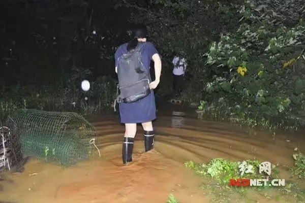 ▲6月24日深夜,红网时刻新闻记者卢欣到达常德市鼎城区,穿上雨鞋来到抗洪一线采访。