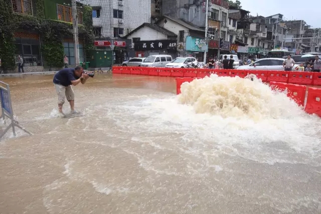 ▲7月1日,长沙市西湖路,湘江洪峰倒灌,湖南日报记者郭立亮在现场拍摄采访。