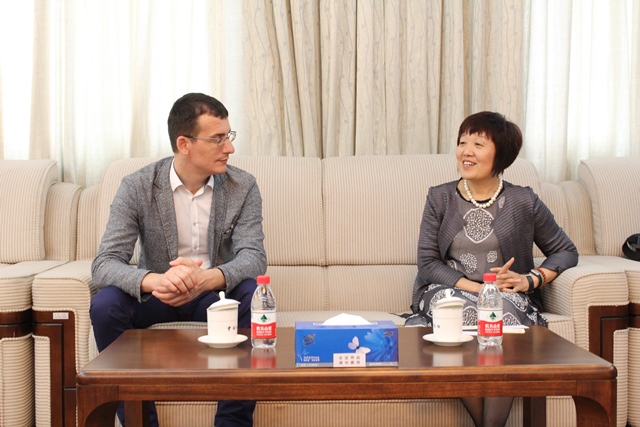 中国记协书记处书记王冬梅(右)与乌克兰记协主席谢尔盖•托米连科亲切会谈 陈涛 摄