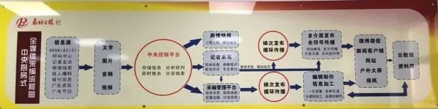 媒体记者全部配发手机,随时将稿件回传至中央厨房,实现新闻资源汇集。中央厨房经过加工和分类,分送给不同媒体共享使用。