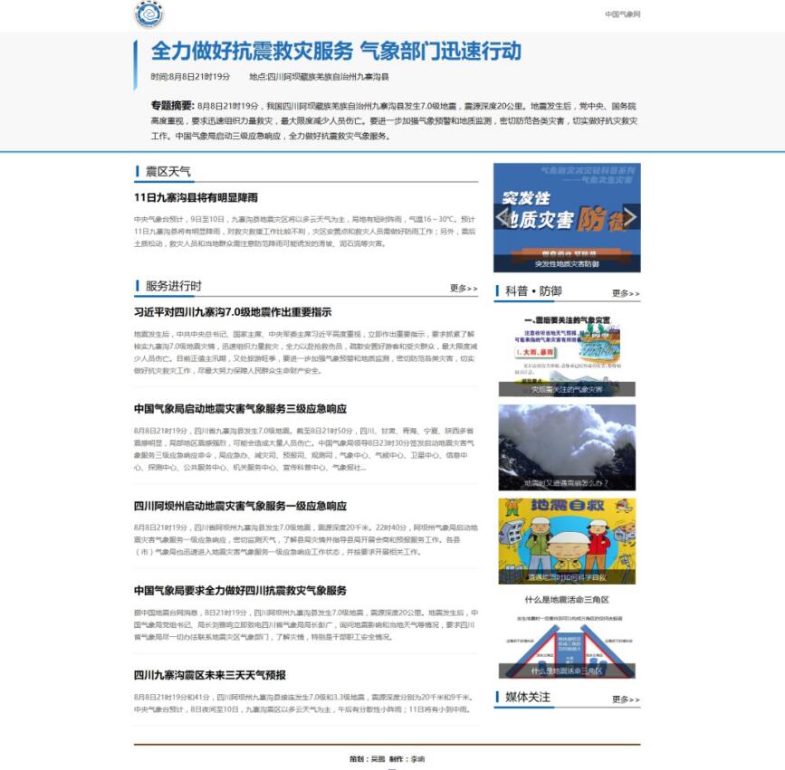 8日22时20分,报社应急记者、中国气象网值班编辑、气象微博微信值班编辑第一时间滚动编发消息,及时反映相关情况。8日23时至9日9时共发稿16篇,其中,先后发布《中国气象局要求全力做好四川抗震救灾气象服务》《中国气象局启动地震灾害气象服务三级应急响应》《四川九寨沟震区未来三天天气预报》以及科普图解《防震减灾避险科普知识》《突发地质灾害防御》等文章5篇;9日早晨,网站又及时转载《习近平对四川九寨沟7.0级地震作出重要指示 李克强就抗震救灾工作作出批示》,随后推出专题“全力做好抗震救灾服务 气象部门迅速行动”,更新发布科普图解3个,发布《四川阿坝州启动地震灾害气象服务一级应急响应》等服务动态稿件。