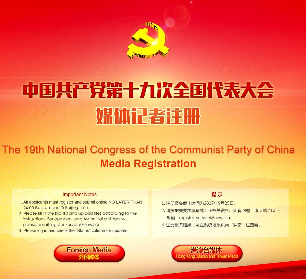 为方便外国媒体记者和港澳台媒体记者提交采访申请,大会开通记者报名注册系统(域名:http://cpc19reg.zgjx.cn),欢迎外国媒体记者和港澳台媒体记者通过该系统提交报名注册申请。采访申请受理时间自2017年9月8日起,至2017年9月25日止。