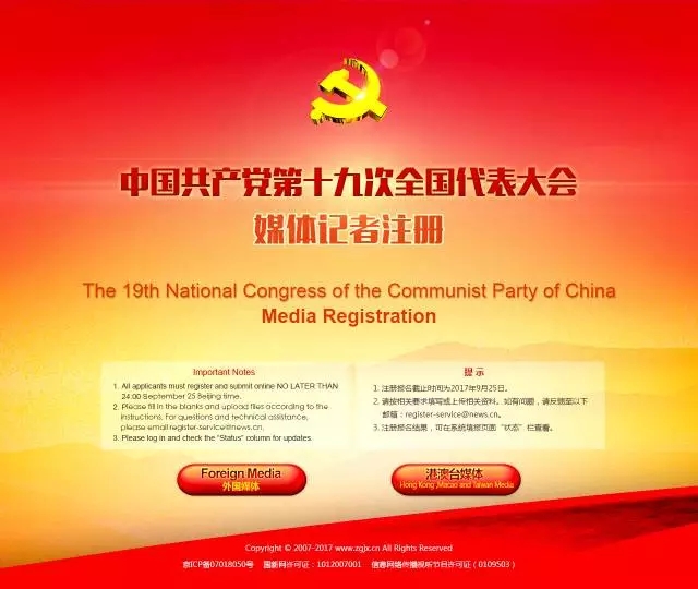 为方便外国媒体记者和港澳台媒体记者提交采访申请,大会开通记者报名注册系统(域名:http://cpc19reg.zgjx.cn),欢迎外国媒体记者和港澳台媒体记者通过该系统提交报名注册申请。采访申请受理时间自2017年9月8日起,至2017年9月25日止。