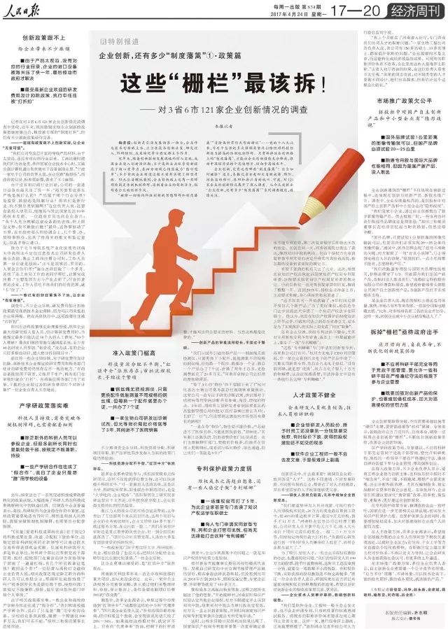 眼睛向下、脚步向下、走进田埂、搞好调查。2017年4月24日至5月26日,《人民日报》分别在《经济周刊》《科技视野》版上刊登6篇“企业创新,还有多少‘制度藩篱’”的调查报道,展示了对3省6市121家企业创新进行调研的成果。第一篇为整版报道,以《这些“栅栏”最该拆!》为题,聚焦企业创新过程中面临的政策性障碍,其他5篇则按照创新链条,从项目、人才、资金、知识产权、市场推广等方面对影响企业创新的各种“制度藩篱”进行了披露和分析。