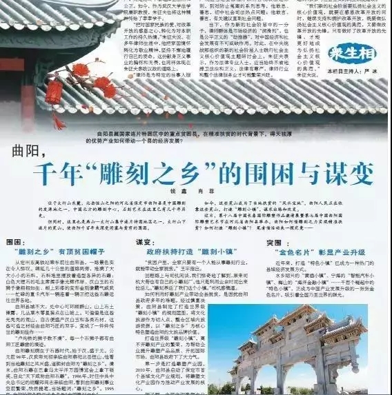 图片美化版面。行文中,适当使用图片能够为文章增彩,有利于形成视觉冲击,使受众获得丰富的审美体验,防止疲劳现象的出现。除此之外,将标题巧妙地用多种色彩统一起来使文章重点突出,层次清晰,加深读者印象。8月10日的《曲阳,千年“雕刻之乡”的围困与谋变》则是如此,首先使用照片突出主题——以古色古香的中国建筑修饰大标题,吸引读者的阅读兴趣,其次文中辅以照片和蓝色小标题,将雕刻之乡的发展变化直观呈现出来,加深读者的理解。