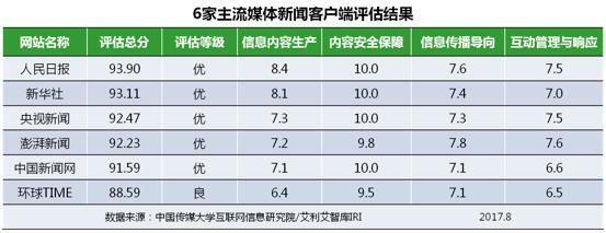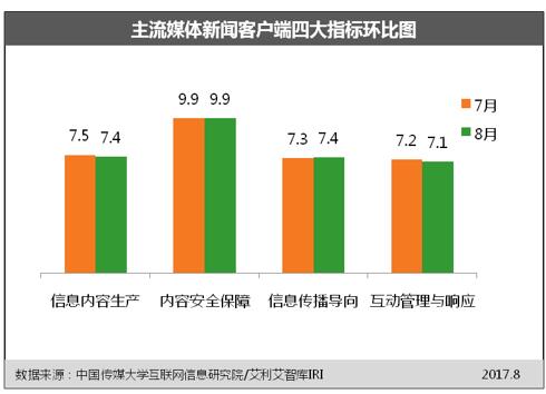 9月21日,中国传媒大学互联网信息研究院发布《新闻客户端信息生态指数2017年8月榜》。评估结果显示,主流媒体新闻客户端信息生态总体为优,各指标相对均衡,少数客户端还需加强信息内容生产、互动管理与响应;商业网站新闻客户端信息生态总体为良,内容安全保障方面较上月有所提升,各指标还需加大力度进一步提升。8月,各新闻客户端信息生态主要呈现以下特点:
