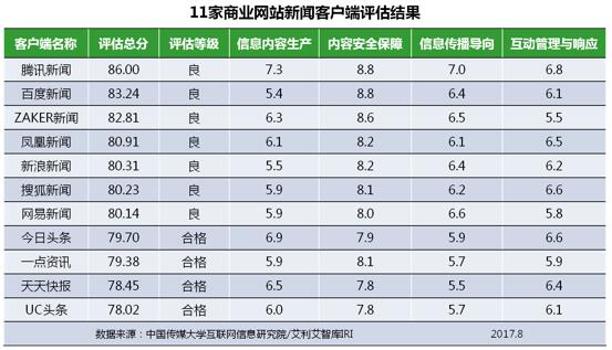 8月商业网站新闻客户端信息生态指数总分平均值为80.84,较上月提升1.54,其中,7家生态表现为良,4家表现为合格,腾讯新闻、百度新闻排名前列。11家商业网站新闻客户端评估结果如下: