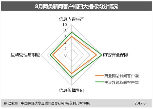 主流媒体新闻客户端与商业网站新闻客户端四大指标均分对比情况如下图: