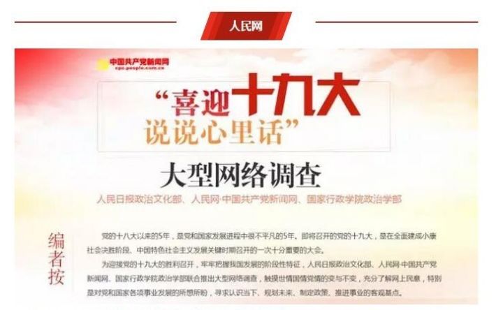 人民网创意推出“喜迎十九大 说说心里话”大型网络调查,问卷除基本情况外,分两大部分,第一部分“总体回顾与展望”为必答题,涵盖党的十八大以来五年的成就以及展望;第二部分为选答题,包含 “全面建成小康社会”“全面深化改革” “全面依法治国”“全面从严治党”4个分项。除此之外,人民网还推出了“喜迎十九大触摸获得感”“喜迎十九大 网上有奖知识竞赛”等活动,极大增强了网民的参与感。