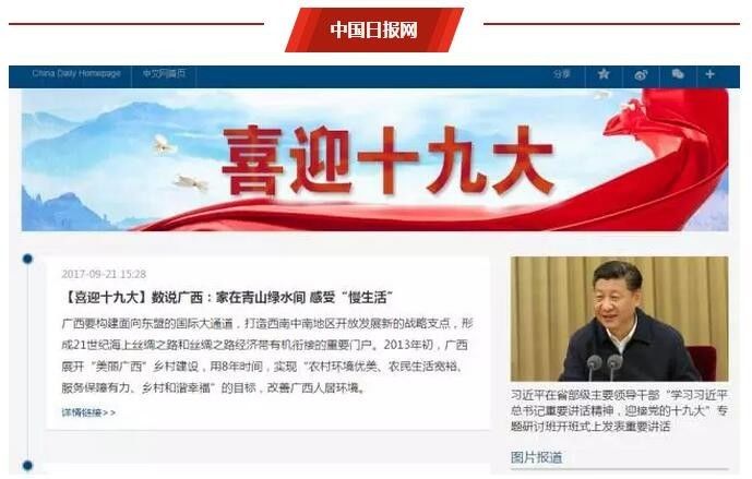 中国青年网的主题页面风格鲜亮、充满朝气。除系列相关报道外,横跨页面的图片新闻宏大震撼,“满满获得感”专题贴近网民喜闻乐见的风格,如《新四大发明之一的中国高铁东南亚火了!》。中国青年网还推出了独家策划的系列图解新闻,为网友送上满满的新闻大餐。
