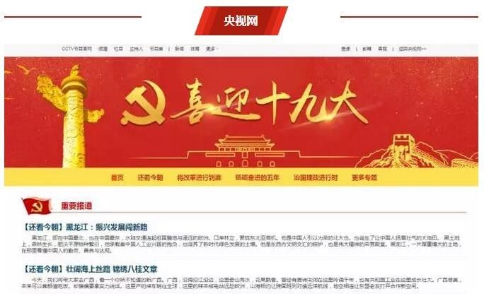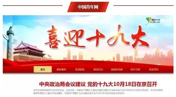 中国共产党第十九次全国代表大会将于2017年10月18日在北京召开。为迎接党的十九大胜利召开,15家中央主要新闻网站抽调精兵强将,精心策划,拿出十八般武艺,用各种创新传播、别具特色的方式,开设创建喜迎十九大专题,营造良好的网络舆论氛围。“网络传播”微信公众号摘取各网站的宣传亮点,特此分享。