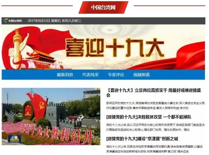 中国台湾网除推出“迎接党的十九大”“喜迎十九大”系列报道外,推出“代表风采”“专家评论”“视频报道”等版块。同时,中国台湾网关注两岸交流,在专题中刊发海外学者、海外侨胞等相关访谈,丰富了网友视角。