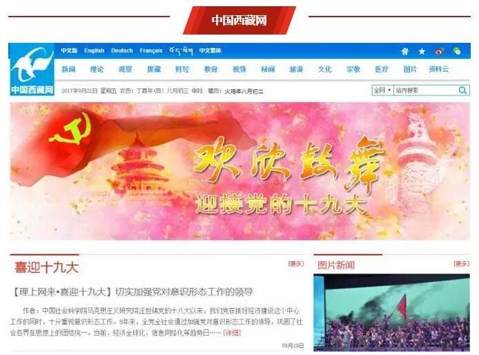 中国西藏网推出“欢欣鼓舞 迎接党的十九大”专题页面,主题图配色淡雅、十分喜庆。网页推出“喜迎十九大·文脉颂中华”“理上网来·喜迎十九大”系列专题报道,并配以相关图片新闻,并在“媒体关注”版块刊发微视频、H5等报道。