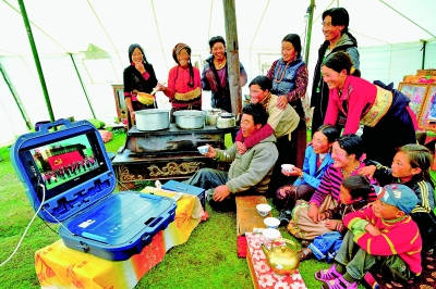 广播电视规模和覆盖持续扩大,新闻传播能力持续增强,其中直播卫星用户突破1亿,规模处于世界前列。图为四川省甘孜州甘孜县达通玛片区卡龙乡卡龙村的牧民收看“村村通”直播卫星电视。