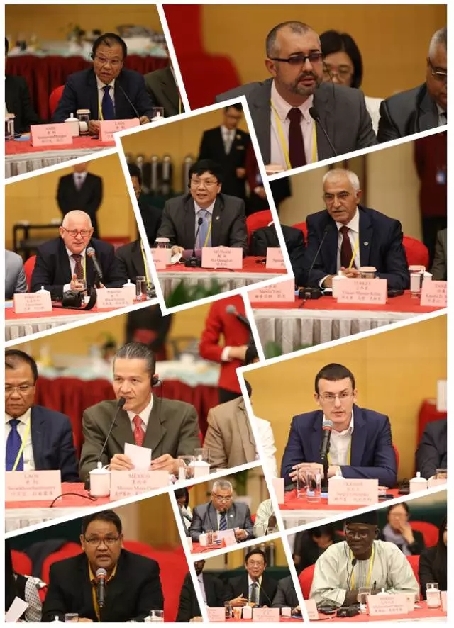 在设在梅地亚宾馆的十九大新闻中心,各国代表按国家英文首字母顺序以圆桌形式就座,会场被热烈而友好的气氛所笼罩。中国记协主席张研农代表中国记协发表热情洋溢的致辞,并向与会代表宣读《“一带一路”记者组织倡议书》。
