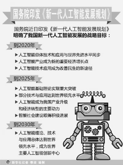 日前,国务院印发的《新一代人工智能发展规划》明确,到2020年,人工智能产业成为新的重要经济增长点,人工智能技术应用成为改善民生的新途径;到2025年,人工智能成为带动我国产业升级和经济转型的主要动力,智能社会建设取得积极进展。