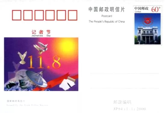 中国邮政2000年11月8日发行记者节纪念邮资明信片1枚