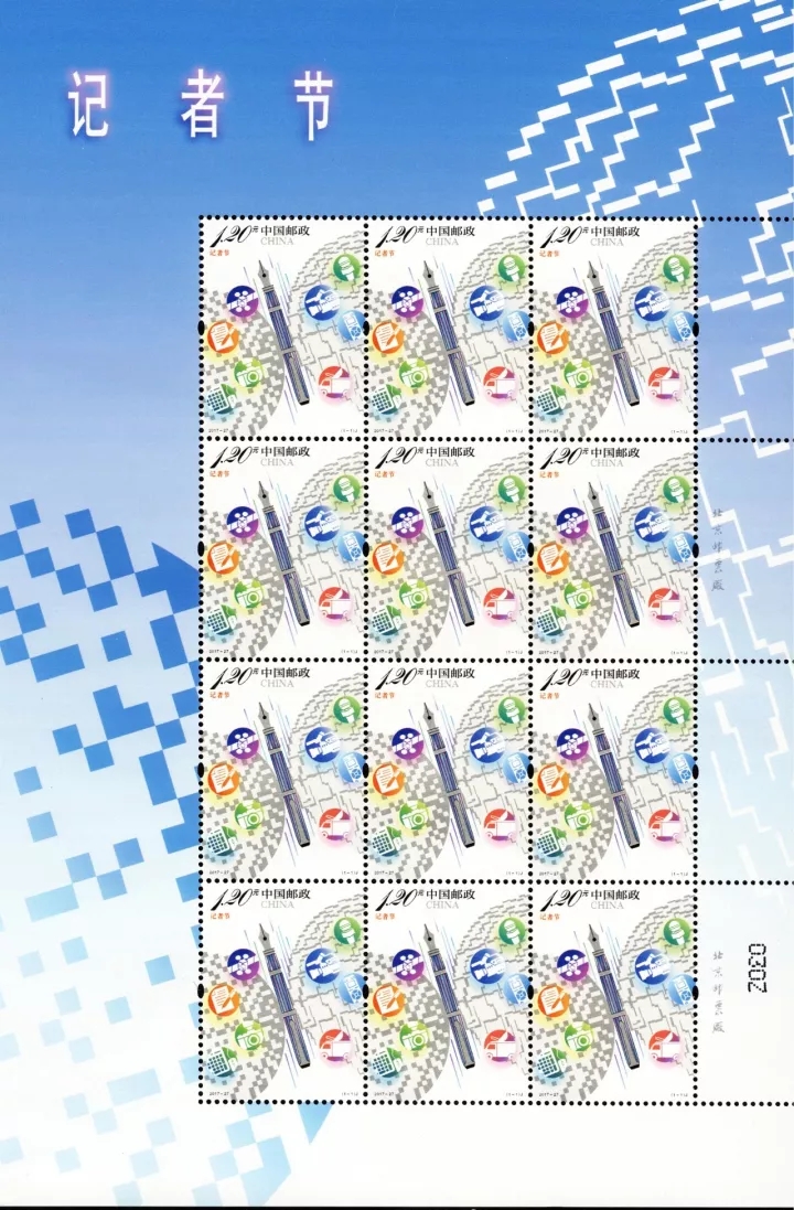 中国邮政2017年11月8日发行《记者节》纪念邮票1套1枚,整版12枚