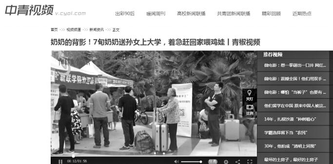 其实,这个千万级播放量的爆款短视频,讲述的是今年9月开学季,一位老奶奶送孩子上大学的普通故事。但是,青椒视频选材独特,人物典型,形象有反差,并以校园实拍、抓拍、跟拍的视频形式直观地表达展现,画面内容丰富,剪辑用心考究,视觉冲击力强,故事戳中泪点,直抵人心深处。