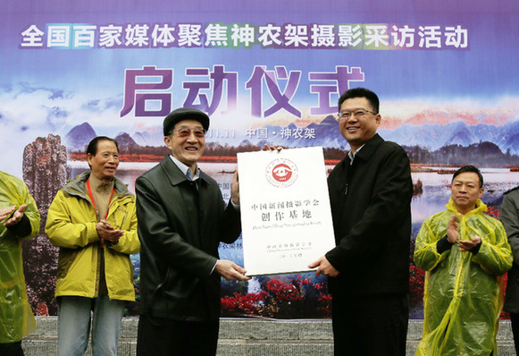 全国百家媒体聚焦绿色神农架摄影采访活动启动仪式上,中国新闻摄影学会原会长于宁(左)向神农架林区授予“中国新闻摄影学会创作基地”牌匾