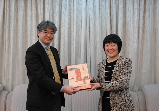 中国记协书记处书记王冬梅(右)向日本新闻代表团团长中泽克二赠送礼物 张阳 摄