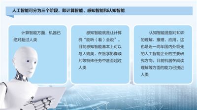 “从技术角度讲,通常把人工智能分为三个阶段,即计算智能、感知智能和认知智能。”科大讯飞研究院院长胡国平说,在计算智能方面,机器已绝对超过人类;感知智能就是让计算机“能听(看)会说”,现在感知智能基本上可以与人媲美,在医学影像读片等特殊任务中甚至超过人类;认知智能是指对知识的理解、推理、应用,近一两年,国内外领先的人工智能企业主要在做这方面的研究,目前机器在阅读理解等方面的能力已接近人类。