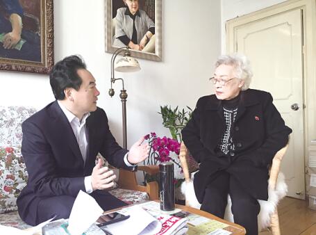 吉林日报社总编辑陈耀辉采访著名电影表演艺术家秦怡。吉林日报社 供图