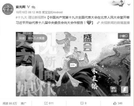 十九大期间,“紫光阁”微博直播窗口的阅读量就达到86万以上。《紫光阁》杂志社 供图