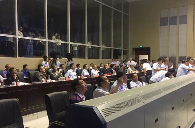 推迟发射的消息出来后,指控大厅里,专家们都指着大屏幕紧张地讨论着