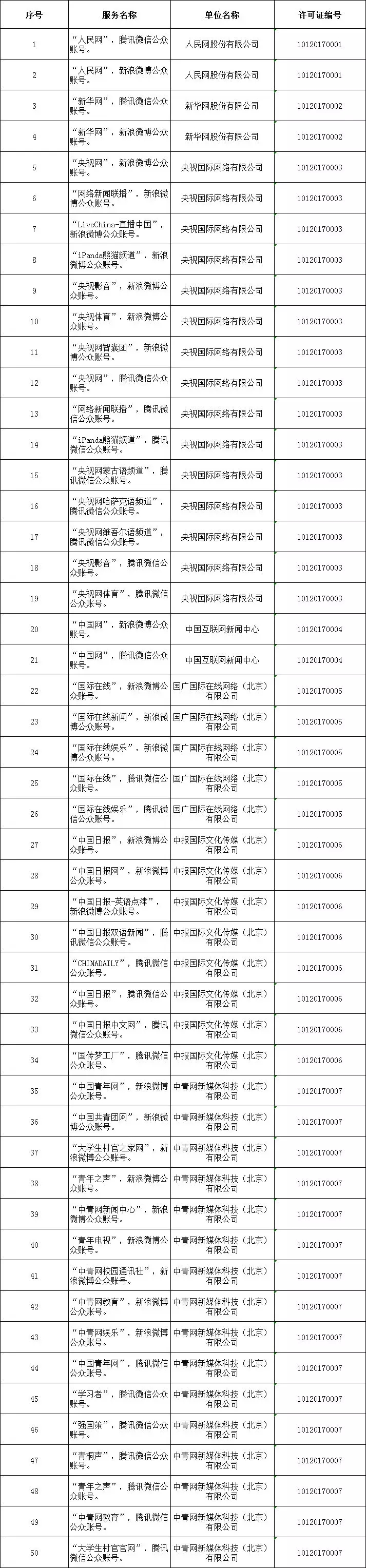 《规定》实施以来,国家互联网信息办公室组织开展互联网新闻信息服务许可证换发工作。现将中央互联网新闻信息服务单位相关许可信息予以公开,包括:互联网站94个,应用程序50个,论坛14个,博客6个,微博客2个,公众账号292个,即时通信工具1个,网络直播3个,共计462个服务项。
