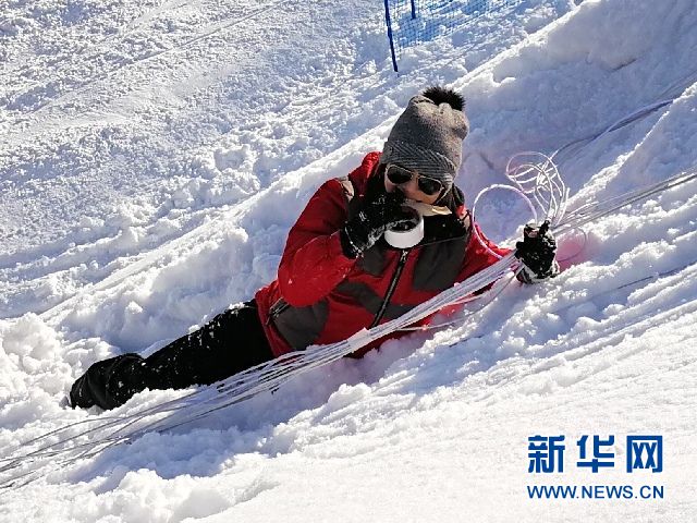 新华社技术团队人员肖梦帆在雪上项目赛场布线。