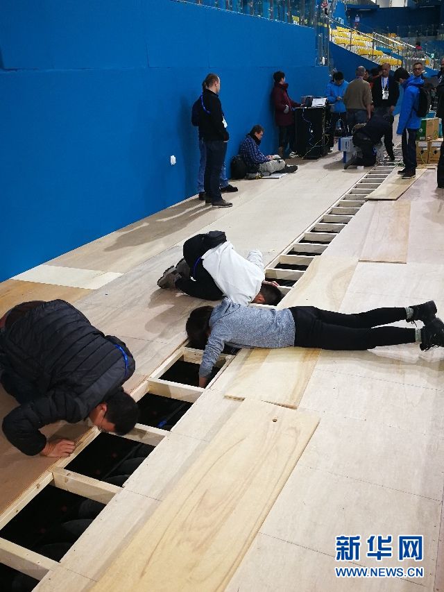 新华社技术团队人员肖梦帆(中)与同事一起在冰上项目赛场布线。