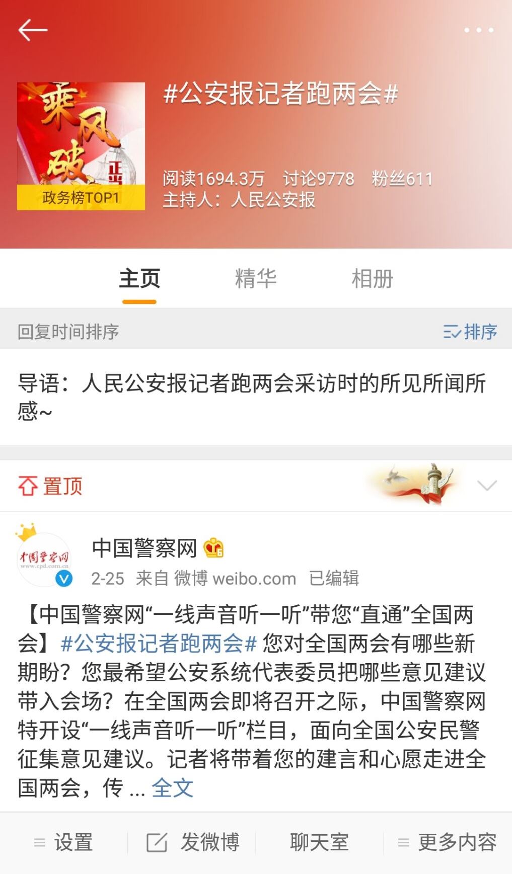 截至3月15日,报社报网官微#公安报记者跑两会#等话题阅读总量破4000万,报网微信公号阅读量近1400万,中国警察网全国两会报道点击量破3000万,全国政协十三届一次会议开幕当天,#公安报记者跑两会#话题阅读量位居新浪政务话题榜首。