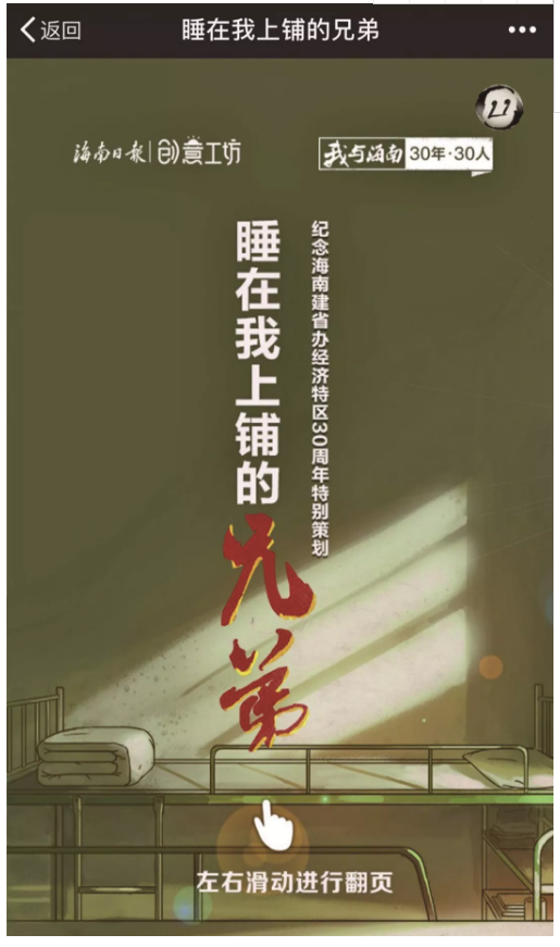 对于海南来说,今年是特殊的一年——海南建省办经济特区30周年,也将迎来中国改革开放40周年。在此重要节点,如何讲好中国故事、海南故事?怎样运用新媒体手段以小见大?1月25日《海南日报》推出的创意手绘H5《睡在我上铺的兄弟》给出了别具匠心的答案。作品一经推出,迅速在朋友圈引发刷屏,海南省内多家媒体“两微一端”纷纷转发,作品点击量一路高扬,突破10万+,取得了良好的传播效果。