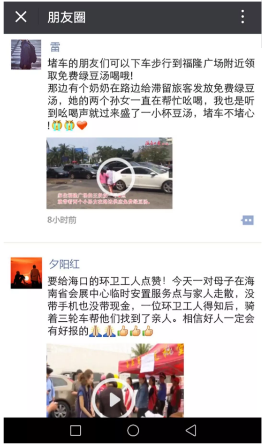 2018年2月19日起,海南海口市遭遇罕见大雾袭扰,每日上万过海车辆滞留海口三港,关键时刻,海南省、海口市各部门启动一级应急响应,为滞留旅客提供了包括交通疏导、信息通达、环卫餐饮等多项高效、温馨的服务。为体现“堵路不堵心,情暖回家路”的主题,海南日报新媒体策划了H5《一位过海滞留女游客的24小时“朋友圈”》,以女网友“佳希”的视角,巧妙地把她一行感受到温馨服务的故事,用逼真“朋友圈”的形式做了表达,阅读量高达78万。