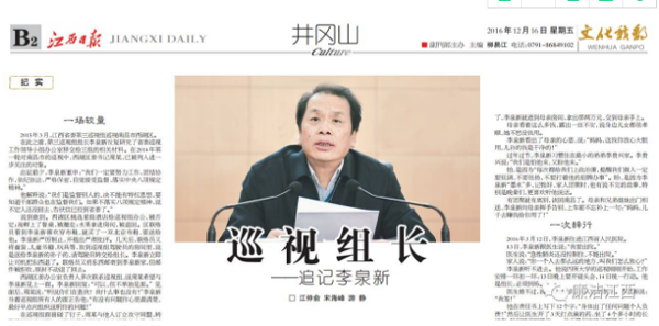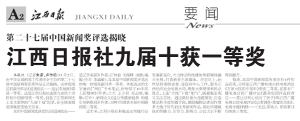 新闻宣传再上高度。2017年以来,江西日报围绕中心、服务大局,弘扬主旋律、凝聚正能量,致力为建设富裕美丽幸福江西营造良好的舆论氛围,提供坚定的舆论支持。11月2日,由中华全国新闻工作者协会主办的第二十七届中国新闻奖获奖作品正式揭晓,由本报报送的副刊作品《巡视组长——追记李泉新》喜获一等奖。这是江西日报社连续九届共十次折桂中国新闻奖一等奖,创造了江西新闻史上史无前例的“九届十冠”纪录,在全国省级党报集团里绝无仅有。