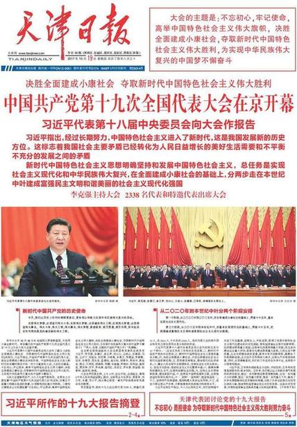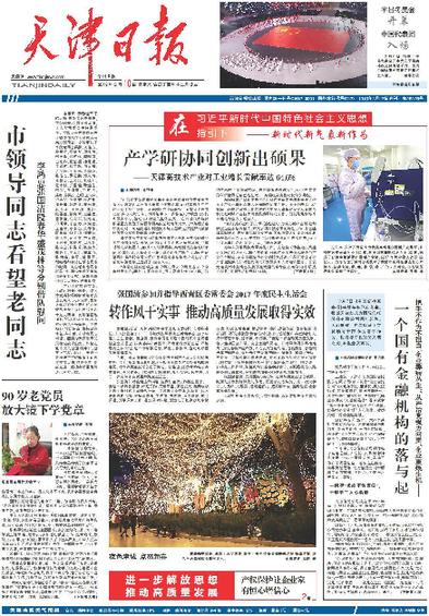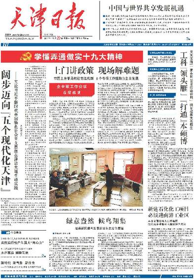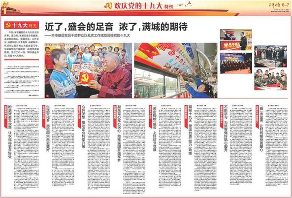 做好党的十九大宣传报道。《天津日报》将十九大宣传报道作为压倒一切的政治任务,按照会前、会中、会后三个阶段精心组织、聚焦重点、掌握节奏、形成声势,做到了规定动作及时准确、有声有色,自选动作规模空前、出彩出新,为十九大胜利召开和十九大精神学习宣传贯彻提供了有力舆论支持。从7月初开始,就在一版显著位置推出“砥砺奋进的五年”“喜迎十九大”等专栏,刊发系列成就性报道,对五年来我国和天津各方面事业发展成就进行了全面回顾。从10月18日开始至11月21日,以每天3至8个整版的篇幅推出“欢庆党的十九大特刊”“学习宣传贯彻党的十九大精神”“学懂弄通做实十九大精神”等专版,全景反映大会召开盛况,生动展现全国上下和天津各界干部群众深入学习宣传贯彻十九大精神的情况。