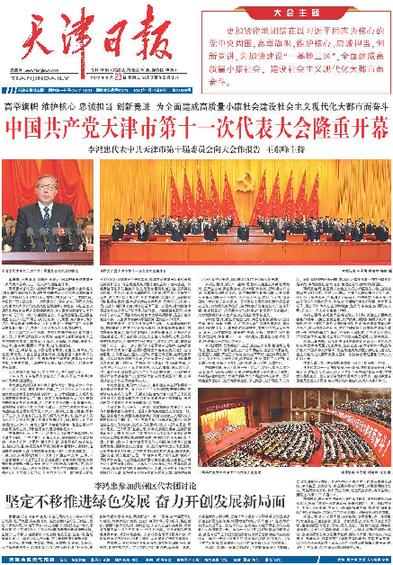 做好天津市第十一次党代会的宣传报道。提前三个月开始研究策划选题,对天津近五年来特别是十八大以来取得的成就进行全面分析梳理。3月27日,“天津这五年”专栏在天津日报头版头条推出,至5月21日党代会开幕前结束,分“发展篇”“创新篇”“民生篇”“保障篇”四个板块,刊发了45篇综述和多张图片,为党代会胜利召开营造了浓厚氛围。大会开幕后,完成好大会议程等“规定动作”的同时,精心策划做好“自选动作”:在要闻版显著位置推出“读报告、话发展”专栏,围绕“五个现代化天津”建设目标,每天推出一篇主题侧记;推出“基层代表履职记”专栏,每天刊发一位基层代表的履职故事;推出“党代会观察”专栏,每天推出主题评论。大会结束后,开设“贯彻落实党代会精神”专栏,推出“区委书记话发展”等多篇主题报道,生动呈现了全市上下认真贯彻落实党代会精神、以实际行动喜迎党的十九大胜利召开的良好风貌。