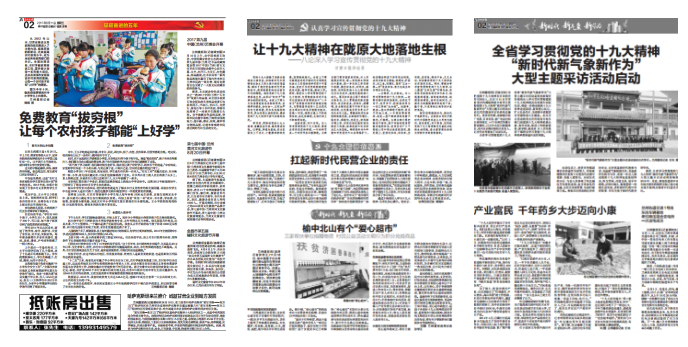 二是全媒体浓墨重彩做好党的十九大的宣传报道,形成规模和声势。在党的十九大的宣传报道中,兰州晨报始终把政治要求放在第一位,牢牢把握正确政治方向和舆论导向,把责任意识落实在每一个环节。在党的十九大期间,兰州晨报集中重点版面,全面报道会议进程、解读党的十九大报告,会议开幕以14个整版的规模、会议胜利闭幕以13个整版的规模强化报道,会议期间平均每天以9个整版的规模进行报道,形成了规模和声势。10月16日—26日兰州晨报封面头条以及封面内容全部为党的十九大有关内容。兰州晨报采编各环节牢牢树立把关意识,落实到每一行标题、每一个字、每一个标点中,精心制作版面,报眉、栏头庄重、醒目,版面编排精美。党的十九大期间,兰州晨报新媒体各端确保在第一时间置顶发布相关图文内容,两微一端充分发挥社交媒体的特点,及时推送视频、图文稿件。兰州晨报掌上兰州及微博、微信发布的《我爱你,中国》《一张图,带你看懂十九大报告》《你的2050是啥样?新时代动感长卷告诉你》《@所有人:他们邀请你,一起为新时代打call》等稿件,侧重视频、图片、数说等呈现方式,标题生动贴切,编排简洁明快,视角新颖独特。三是认真做好学习宣传贯彻党的十九大精神的宣传报道。兰州晨报开设《认真学习宣传贯彻党的十九大精神》《我的学习笔记》《十九大精神在基层》《新时代新气象新作为》等专栏,充分报道党的十九大胜利闭幕后,甘肃省党员干部群众满怀喜悦之情,学习宣传贯彻党的十九大精神的热潮,在习近平新时代中国特色社会主义思想和党的十九大精神指引下,以饱满的精神状态加快发展的生动实践和展现出的新气象、新变化。