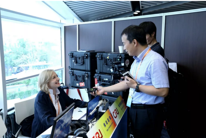 国际在线记者黎萌(右)请中央广播电视总台国广俄罗斯记者谈自己对峰会的感受。