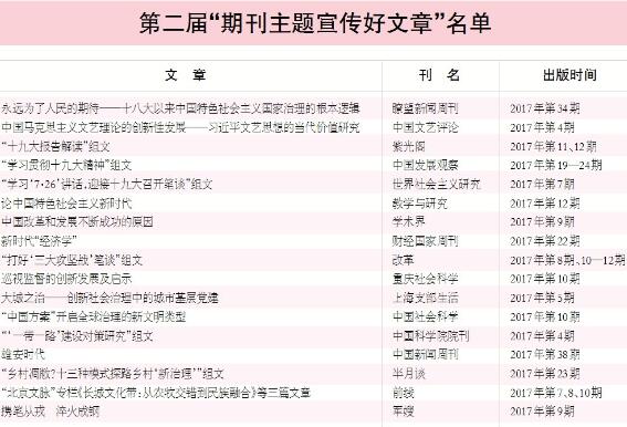 6月26日,第二届“期刊主题宣传好文章”推荐活动入选文章揭晓。经过初评和终评,《瞭望新闻周刊》的《永远为了人民的期待——十八大以来中国特色社会主义国家治理的根本逻辑》、《中国文艺评论》的《中国马克思主义文艺理论的创新性发展——习近平文艺思想的当代价值研究》、《紫光阁》的“十九大报告解读”组文等17篇(组)文章最终入选。(名单另发)