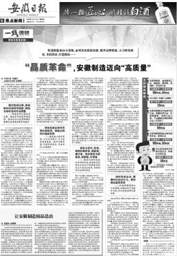 经济质量“高不高”,反映在产品质量“好不好”上。《“品质革命”,安徽制造迈向“高质量”》以具体的“产品质量”为切入口,提出推进品质革命,打造“高质量产品”,是发展“高质量经济”的必由之路。
