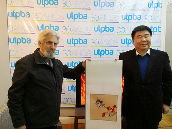 中国新闻代表团团长、中国记协书记处书记张百新(右)向拉美记联主席胡安•卡洛斯•卡马乔赠送纪念品 马玉安 摄