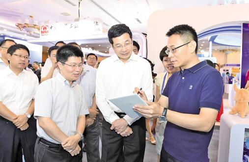 7月24日至26日,第八届中国数字出版博览会在北京国际会议中心举行。中宣部副部长、国家新闻出版署署长、国家版权局局长庄荣文出席开幕式并作主旨报告。图为庄荣文在展区听取智能手写阅读设备情况介绍。记者 杨志成 摄