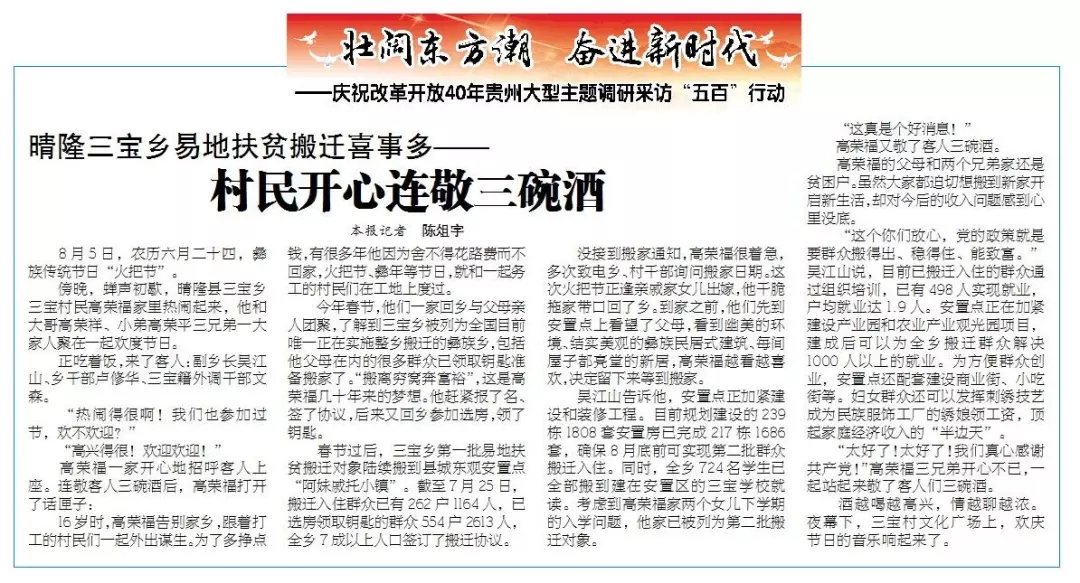 8月18日,《贵州日报》头版的一则新闻《晴隆三宝乡易地扶贫搬迁喜事多 村民开心连敬三碗酒》,通过记者讲述与三宝乡干部一起深入彝族传统节日“火把节”现场,走进三宝乡村民高荣福家的故事,让受众如临其境,感受到了易地扶贫搬迁给贫困群众带来的喜人变化,触摸到了搬迁群众“真心感谢共产党”的感恩奋进的时代脉搏。