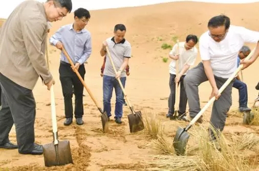 参加全国省级党报总编辑年会的嘉宾们体验麦草方格治沙法。